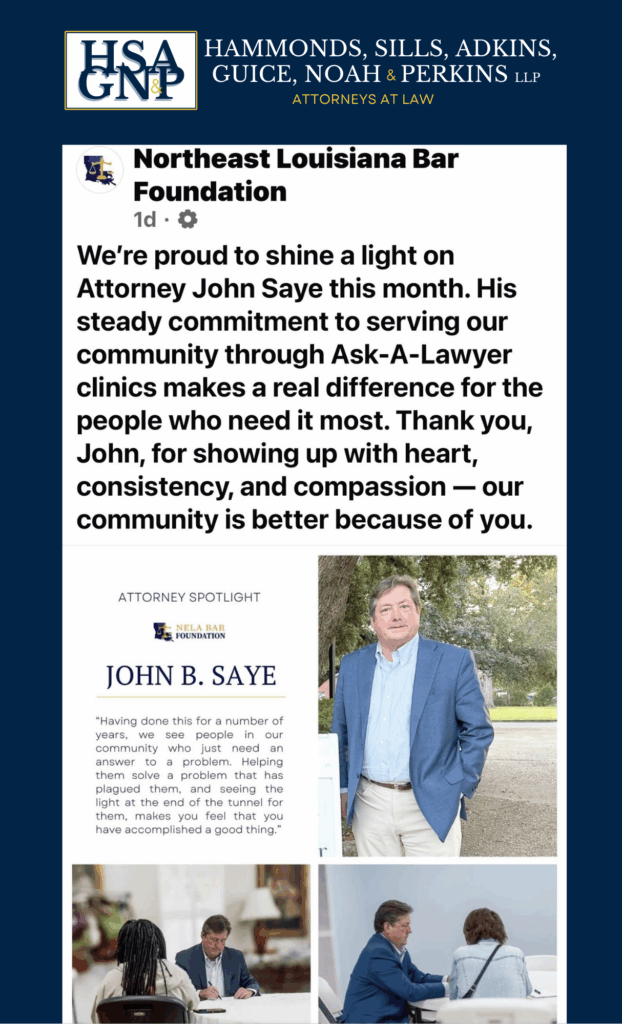 We love seeing our team members being recognized! The Northeast Louisiana Bar Foundation recently shined a light on John Saye for his commitment to the community and volunteering his time. When any member of our team succeeds, we succeed. Thank you, John, for being an example and shining your light on the community.