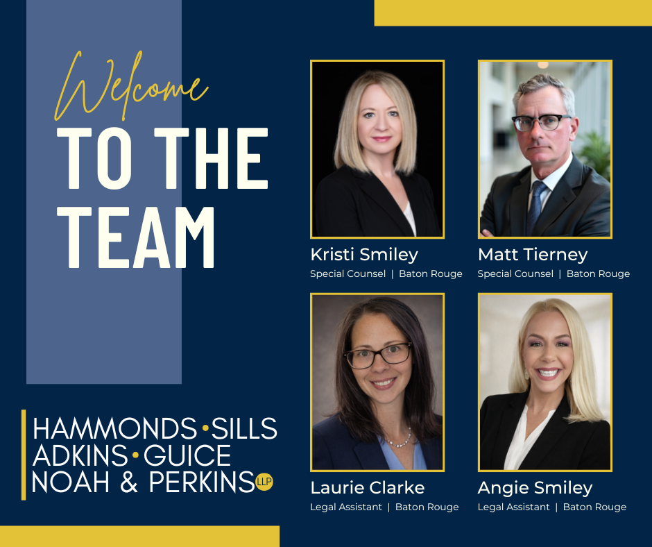 As of April 1, Hammonds, Sills, Adkins, Guice, Noah & Perkins, LLP is proud to welcome Tierney and Smiley, LLC to the HSAGN&P team! Attorneys Matt Tierney and Kristi Smiley bring more than 50 years of combined experience in insurance defense and workers’ compensation, further strengthening our firm’s depth in these key practice areas. Joining with them are their skilled legal assistants, Laurie Clarke and Angie Smiley, whose support and experience will be invaluable as we continue to grow. We are excited about this new chapter and look forward to the great things we will accomplish together.